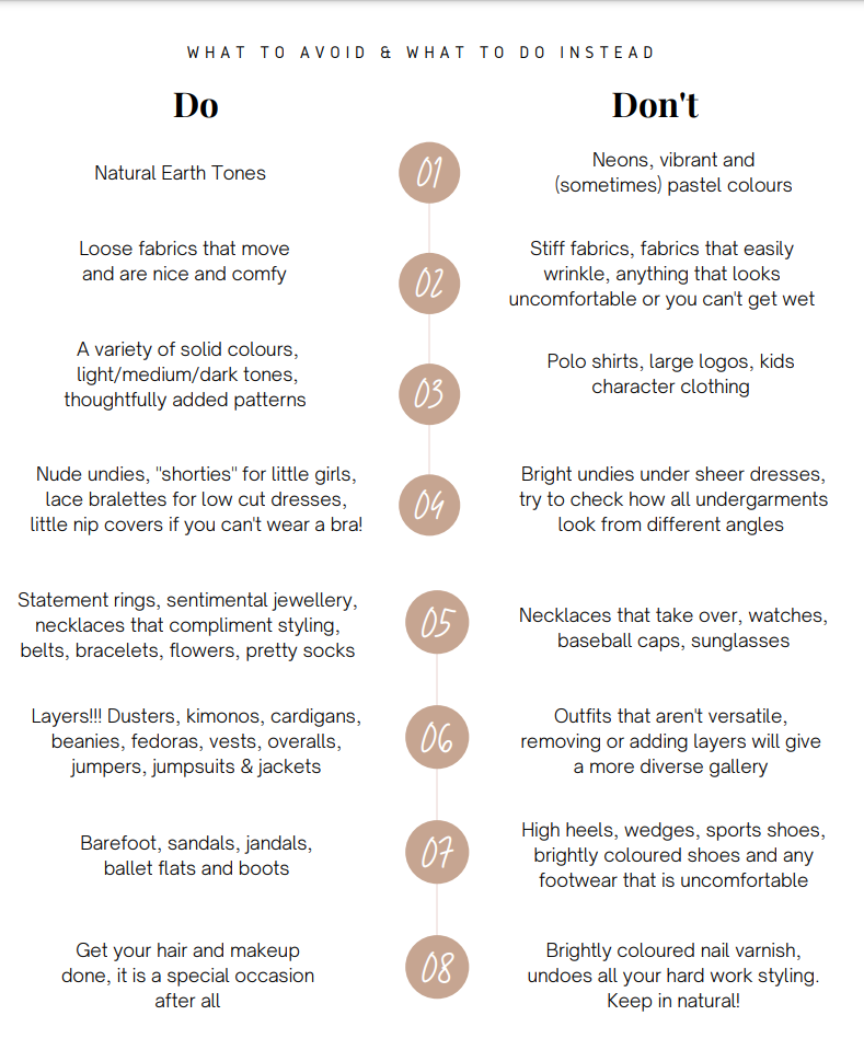 Start shopping, check out my style guide and make use of my client closet. Having your outfits organised now takes away all that stress in the days before your session. Message me your options and let me help with this step!